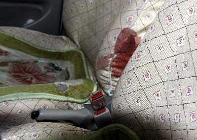 昨天中午,事發(fā)汽車已經(jīng)被拖入奉賢公安分局停車場。車輛左前門車窗玻璃已經(jīng)完全破碎,門框上依然留有黑色物體擊打后留下的痕跡。副駕駛座左側(cè)座椅和靠背的交界處,一攤手掌大小的紅色血跡滲入靠墊,車內(nèi)物體雜亂堆放著。