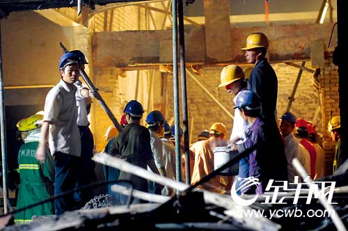 事發(fā)后,省委常委、市委書記朱小丹、市長張廣寧迅速作出批示,要求全力搶救被困人員,查明事故原因。市政府副秘書長潘安、市應(yīng)急辦主任鄧慶彪及市公安局、市公安消防局、市國土房管局、市建委、市衛(wèi)生局、市安監(jiān)局、白云區(qū)委、區(qū)政府主要領(lǐng)導(dǎo)和相關(guān)部門負(fù)責(zé)人第一時間趕到現(xiàn)場,組織開展搶險救援工作。
