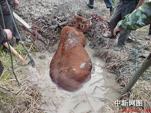 中新網(wǎng)杭州三月十三日電(記者 柴燕菲 實習(xí)生 汪恩民 通訊員 朱紅霞)昨天,浙江橫峰一頭千斤重的老黃牛陷進泥潭險些喪命,在當(dāng)?shù)厝罕姷拇罹认拢@頭老黃牛才撿回一條命。