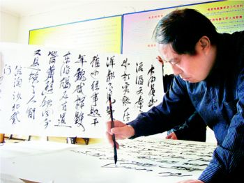 昨天,記者在延慶縣延慶鎮(zhèn)米家堡村見到了49歲的張海河。操著濃重延慶口音的他告訴記者:“我只有初中文化,識(shí)字不多,先是種地,后又做建筑安裝,沒想到老了老了,還能練書法,讓鄉(xiāng)親們覺得我是個(gè)文化人!”