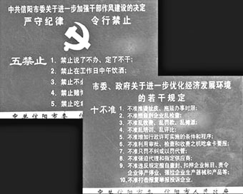 當(dāng)天大會(huì)上,《中共信陽市委關(guān)于進(jìn)一步加強(qiáng)干部作風(fēng)建設(shè)的決定》和《中共信陽市委信陽市人民政府關(guān)于進(jìn)一步優(yōu)化經(jīng)濟(jì)發(fā)展環(huán)境的若干規(guī)定(試行)》兩份“紅頭文件”公布并開始實(shí)施。