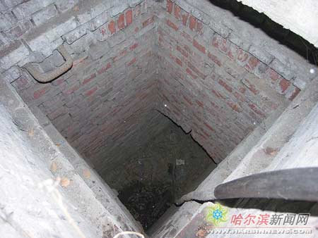 龍江橡膠廠早已停產(chǎn),部分廠房正在拆遷。院內(nèi)有一棟灰色的五層樓,據(jù)稱當年曾是日本憲兵隊所在地。在樓南側(cè)50米遠處有一平房,原來是龍江橡膠廠的生產(chǎn)車間。地道口就在距離平房不足50米的草地內(nèi),一米見方,上面覆蓋著石板和苫布等雜物。移開上面的石板,一股夾雜著濃重霉味的潮氣從洞口噴涌而出。里面黑洞洞的,打開手電往里看,深近10米。地道頂端距離地面約5米,地道有一人來高,紅磚砌成,頂部為圓拱形。