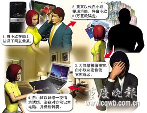 白小欣,23歲,中專文化。2006年4月底,白小欣在騰訊QQ和天涯論壇上認識了黃某。黃某自稱是一財務(wù)公司老總,見多識廣,什么事都能辦到。網(wǎng)聊幾次后,白小欣把父親留下一塊土地的事告訴了黃某。