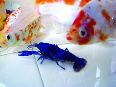 然而,由于這只龍蝦穿著罕見的藍(lán)色“盔甲”,與旁邊的紅色龍蝦形成了鮮明的對(duì)比。它看起來很活潑,在魚缸中和觀賞魚一起嬉戲,紅的金魚、藍(lán)的龍蝦構(gòu)成一幅漂亮的畫面。