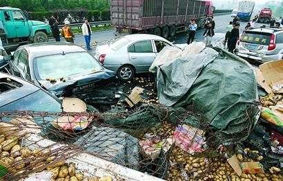 下午4點40分左右,擠成一團的車被一一拖開。救援人員開始清理路面,將土豆、碎玻璃掃到路邊。目前,事故原因還在調查中。(記者 黃智義 實習生 張葉青)