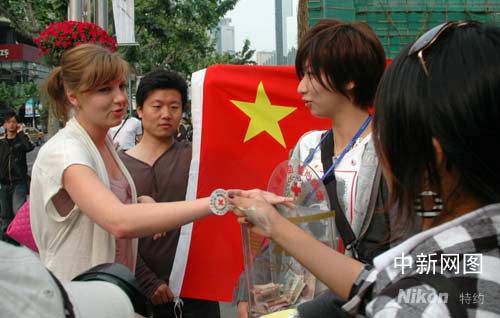 今天下午,來自上海大學(xué)巴黎國際時裝藝術(shù)學(xué)院的大學(xué)生們第一時間自發(fā)聯(lián)系了上海市靜安區(qū)紅十字會,組織了一次主題為“以人道的名義,伸出您的援手”的大型募捐活動。下午3點,在上海市中心最繁華的商業(yè)區(qū)南京路,在“地震無情人有情,盼望好人獻愛心”的醒目橫幅下,上海大學(xué)巴黎藝術(shù)學(xué)院的百余名學(xué)生與來自法國,美國,德國,意大利的外籍教師共同走上街頭,為四川震區(qū)災(zāi)民奉獻愛心。