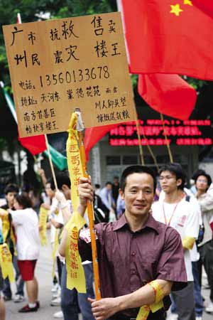 昨日,有一個人,隨著號召募捐行動的志愿者隊伍,從正佳廣場西北門的活動現(xiàn)場一直跟到另一主會場僑鑫教育大院。他始終默默站著,沒和任何人說話;而他手上,則舉著一塊自己制作的簡陋牌子,上面寫著“廣州市民抗震救災(zāi)售賣樓王”,引來好多路人觀望。