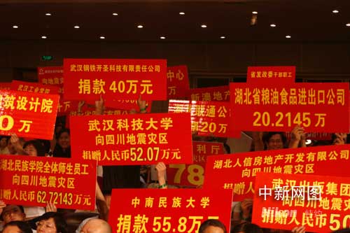 中新網(wǎng)武漢5月22日電 (記者 艾啟平)22日晚8點(diǎn)至11點(diǎn),湖北省抗震賑災(zāi)晚會(huì)《我們心相連》在武漢洪山禮堂舉行。在晚會(huì)現(xiàn)場(chǎng),中共湖北省委書(shū)記羅清泉、湖北省長(zhǎng)李鴻忠等帶頭為四川地震災(zāi)區(qū)捐款,全省企業(yè)和社會(huì)各界及電視觀眾紛紛響應(yīng),截至晚會(huì)結(jié)束時(shí)共收到捐款超過(guò)一億元人民幣。