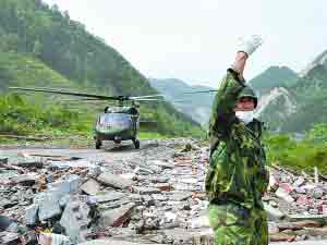 5月19日,空軍某部炮兵科科長(zhǎng)戴志強(qiáng)帶領(lǐng)消防員和志愿者徒步15小時(shí)后,趕至位居深山的巴蜀電力金河水電站,成功搜尋并營(yíng)救14名被困山洞中200余小時(shí)的礦工。