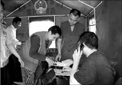 昨天,在什邡市區(qū),開業(yè)的商店在增多,交通運輸在恢復(fù),政府機(jī)關(guān)在堅持上班,受災(zāi)群眾在一步步得到安置,工作生活秩序正在走向正常。維持和捍衛(wèi)著秩序的法院,在受災(zāi)群眾中間,用帳篷搭建起第一座災(zāi)后臨時審判庭。