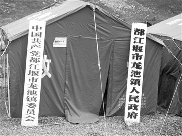 地震發(fā)生后,都江堰市龍池鎮(zhèn)政府樓垮塌嚴(yán)重,部分房屋坍塌成一堆廢墟,未倒的辦公室全成了危房。昨天,記者來(lái)到這里看到的卻是另一番景象:現(xiàn)場(chǎng),許多彩條布搭建成座座“帳篷”,“帳篷”旁矗立著“中國(guó)共產(chǎn)黨都江堰市龍池鎮(zhèn)委員會(huì)”和“都江堰市龍池鎮(zhèn)人民政府”兩塊牌子,高高的竹竿上飄揚(yáng)著一面五星紅旗,宣告著龍池鎮(zhèn)抗震救災(zāi)指揮部成立,各項(xiàng)工作現(xiàn)逐步走上正軌。
