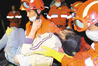 22點(diǎn)28分,馬曉鳳爬出了廢墟,我把她抱上擔(dān)架。突然聽到圍觀的家長和志愿者們雷鳴般的掌聲。