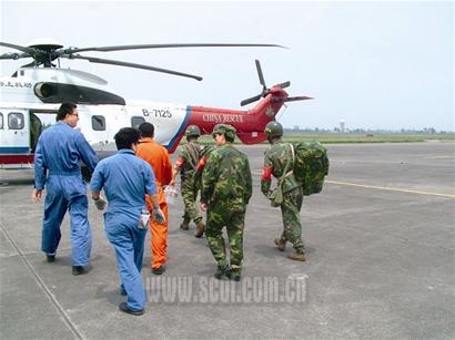 5月21日清晨,廣漢機場緊張有序地展開營救8名被困工人的行動,多架飛機飛向綿竹清平大山偵察?战当硯熍沙鲂》株,背著繩索、攜帶衛(wèi)星定位系統(tǒng)進行救援。