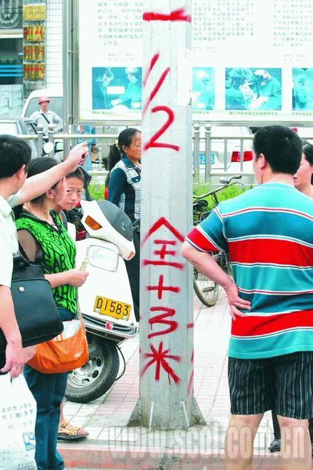 在政府院內(nèi)右側(cè)的三層小樓上,畫出了堰塞湖水潰壩進入城區(qū)的比例刻度,有1/3潰壩、1/2潰壩和全潰壩三條線。記者看到,損失最小的1/3潰壩,洪水淹沒線在一樓中上部,距地面高約2.3米。1/2潰壩,洪水將淹沒二樓小部分,全潰壩則淹沒整個二樓,殃及三樓。
