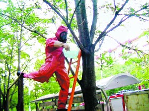 消防隊員穿上防化服,迅速用事先準備好的麻袋將樹上蜜蜂一舉擒獲。 (葉曉彥 通訊員 蔣魁文并攝)