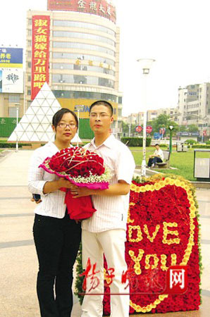 記者昨天下午趕到現(xiàn)場看到,“巨無霸”條幅掛在金龍大廈的東側,由于地處鬧市區(qū),吸引了很多市民駐足圍觀。市民尹先生是“萬里路”的朋友,參與了“萬里路”特別求婚的整個“策劃”過程。他告訴記者,當天中午1時,被男友“萬里路”約到廣場的“淑女貓”,無意中看到“求愛”條幅后先是一怔,剛轉過身來,男友就像變魔術一樣捧出了大把玫瑰花,并向她單膝下跪求婚,毫無思想準備的女孩頓時激動得流下了眼淚。還沉浸在幸福當中的“淑女貓”接受記者采訪時說,她和男友是通過網(wǎng)絡認識的,“萬里路”“淑女貓”都是他們的網(wǎng)名,幾天前男友曾對她表示有件很重要的事情要和她說,當時她沒有過多在意。當天中午見到巨型條幅和999朵玫瑰花后,她感覺整個人都“蒙”了,幸福得“不知所措”、“也不知道說什么好”。