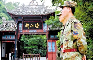 兩千多年前,秦蜀郡守李冰父子修建了雄偉的水利工程都江堰,使之成為巴蜀大地上偉大的防洪和灌溉工程,四川也因此成為富饒豐厚的“天府之國(guó)”。然而,5·12大地震不僅讓都江堰市區(qū)受損嚴(yán)重,世界文化遺產(chǎn)青城山-都江堰也在地震中遭到了不同程度的損壞。日前,在都江堰市街頭,舉目看去,絕大多數(shù)受損樓宇中皆人去樓空,而幽甲天下的青城山和澤被天府的都江堰景區(qū)也已暫時(shí)封門(mén)謝客,景區(qū)內(nèi)除了巡邏的解放軍戰(zhàn)士和救災(zāi)帳篷,已經(jīng)看不見(jiàn)一個(gè)游人。都江堰大壩旁的一條游客通道上,活動(dòng)板房建設(shè)工人正在緊張施工,曾經(jīng)游人如織的景區(qū)道路上,靜靜豎起一大排藍(lán)白相間的板房。