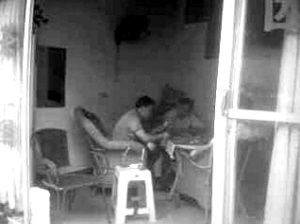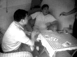 網(wǎng)友“善良老百姓”還在論壇里貼出兩張抓拍的照片:兩名穿藍(lán)色T恤的男子,拿著撲克坐在桌前,桌上散亂地鋪著現(xiàn)金;第三人的面目沒(méi)出現(xiàn)在畫(huà)面里,但可以見(jiàn)到其伸出的一只手。從照片的畫(huà)面判斷,拍攝者當(dāng)時(shí)站在房間外。