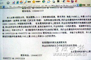 前天下午,記者在天涯網(wǎng)一則求捐肝源的帖子上看到一則跟帖:“本人長期與醫(yī)院合作,現(xiàn)急需要A、B、O三種肝源和腎源,要求男性……”發(fā)帖的是一個名叫“真實(shí)可靠”的網(wǎng)友,帖上留有3個QQ號和1個手機(jī)號碼。昨日下午3時20分,記者撥打了這個手機(jī)。