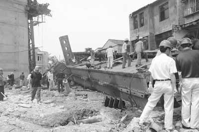 記者看到,這段鐵路橋呈南北走向,向北放眼望去,20多米高的鐵路高架橋像巨龍一樣延伸開(kāi)去。往南看,僅剩200多米的橋面尚未鋪好!岸伎焱旯ち,誰(shuí)知道還會(huì)出這事!苯衲晁氖鄽q的老龍租住的房子在鐵路的東側(cè),距離倒塌下來(lái)的模架最近只有十幾米,中間隔著一條三米多寬的小路。前天上午9點(diǎn)多,老龍從雙嶼鎮(zhèn)農(nóng)貿(mào)市場(chǎng)賣(mài)完菜剛走進(jìn)二樓的房間,就聽(tīng)見(jiàn)一陣“嘩啦啦”的巨響,腳下的地板也在顫抖!暗卣鹆!”老龍沒(méi)有多想,轉(zhuǎn)身奔到樓下,才發(fā)現(xiàn)原本掛在鐵路橋上近50米長(zhǎng)的移動(dòng)模架不見(jiàn)了,橋墩兩側(cè)的房屋被地上騰起的煙塵全部遮住,只有橋墩的頂部還露出了一小段。煙塵持續(xù)了20分鐘才逐漸消散!叭绻鹿侍崆耙粋(gè)小時(shí),死的人會(huì)更多!睋(jù)老龍介紹,發(fā)生事故的那個(gè)路段是交通要道,鐵路東側(cè)的居民買(mǎi)菜,都要穿過(guò)鐵路橋,到橋西側(cè)的雙嶼鎮(zhèn)農(nóng)貿(mào)市場(chǎng)。上午8點(diǎn)左右,正是居民買(mǎi)菜和上班的高峰期!捌匠N覀円渤3南旅娲┻^(guò),只是擔(dān)心上面會(huì)掉下些小石頭或者水泥塊,沒(méi)有想到這下全掉下來(lái)了!绷硪晃痪用窀嬖V記者。