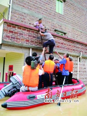 昨日下午4時(shí)許,筆者在該縣播植鎮(zhèn)龍福村委看到,屬下的龍村、羅榕、灣頭等10條村莊已是一片澤國(guó),村道一端和樓房上零星散布的村民正在等待救援,幾艘沖鋒舟和橡皮艇來(lái)回穿梭,把村民們載到安全地帶(如右圖)。從市里全會(huì)請(qǐng)假回來(lái)的縣委書(shū)記譚培安也親臨“澤國(guó)”指揮救援,數(shù)十名縣鎮(zhèn)領(lǐng)導(dǎo)干部正在現(xiàn)場(chǎng)忙碌,村中還不時(shí)傳出如放鞭炮般的倒房聲。一位剛剛被救出的80歲的阿婆說(shuō),活這么大歲數(shù)還未見(jiàn)過(guò)如此大的暴雨和山洪。據(jù)悉,該鎮(zhèn)前日起遭受暴雨襲擊,導(dǎo)致當(dāng)?shù)貝偝呛臃簽E,河基崩潰嚴(yán)重,河水倒灌入村,受浸村莊10多條,受困村民2526人,倒塌房屋117戶352間。前晚起,縣、鎮(zhèn)、村干部齊出動(dòng),分頭深入受災(zāi)村莊連夜動(dòng)員村民撤離,至昨日下午,已全部安全轉(zhuǎn)移。(圖/文談細(xì)育龍?jiān)S李均陽(yáng))