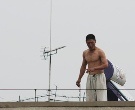 有一名男子拿著望遠鏡,不時地觀察張某的動靜,然后向大家介紹樓頂?shù)那闆r。還有幾個人披著被褥坐在車廂內(nèi),悠閑地觀瞧。(記者 崔顏鋒 東亞經(jīng)貿(mào)新聞)