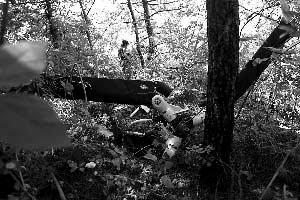 昨日,直升機殘骸在金海湖林區(qū)的山坡上,螺旋槳和機身已經分離。