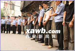 打架吃了虧,就糾集朋友,幫自己報(bào)仇;在報(bào)仇不成的情況下,又將一家網(wǎng)吧燒毀,給網(wǎng)吧造成了50余萬(wàn)元的經(jīng)濟(jì)損失。案發(fā)后,碑林警方迅速出擊,將涉案的5名主要嫌疑人抓獲。昨日下午,警方在案發(fā)現(xiàn)場(chǎng),對(duì)幾名犯罪嫌疑人進(jìn)行了公開處理,得到了周圍群眾的好評(píng)。