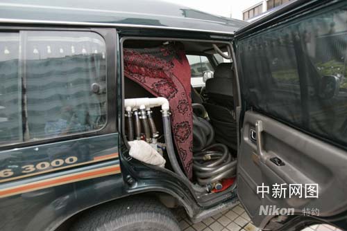 記者今日在佛山市張槎派出所內(nèi)看到,“油耗子”將吉普車改裝成的油罐車內(nèi)“裝備”齊全,車輛側(cè)窗和尾窗玻璃用布簾遮得嚴嚴實實,根本看不到車內(nèi)的情形。