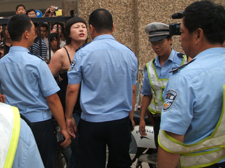 襲警女子態(tài)度囂張 被打警察(右一)的背心已被扯下 (孟繁勇/圖)