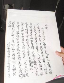 記者看到,溫總理給小樺的回信是在一張宣紙上用毛筆寫出來的,信的內(nèi)容為:“小樺,你六月的信,近日才收到。經(jīng)過這場大的災(zāi)難,你不再是一個愛哭的小女孩了,好像一下子長大了、堅強了、懂事了。我惦念你,惦念災(zāi)區(qū)所有的孩子們。我希望你們在災(zāi)難中懂得人生的艱難,也看到未來的光明,從而更加努力學(xué)習(xí),艱苦奮斗,長大和災(zāi)區(qū)人民一道把家鄉(xiāng)建設(shè)得更加美好。向你的同學(xué)問好,向你的家人問好,向鄉(xiāng)親們問好!焙竺媛淇顬椤皽丶覍 二00八年七月十三日”。