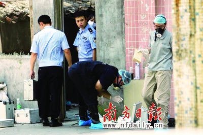 案發(fā)出租屋離同濟(jì)西路只有20米左右、離永豐大廈新一佳商場(chǎng)只有10米左右,出租屋所在的巷內(nèi)停有約10輛警車,警方設(shè)了兩道警戒線,數(shù)名刑警正在現(xiàn)場(chǎng)勘察調(diào)查,圍觀群眾有數(shù)十人。多名戴口罩的民警正在勘查取證,有民警甚至戴著面具。記者在外圍也能聞到一股臭味。