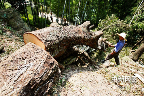 中新網(wǎng)杭州7月29日電(記者 龔讀法 實(shí)習(xí)生 徐珍)日前,浙江省杭州市千島湖遭遇了一場(chǎng)強(qiáng)暴風(fēng)雨,其間還夾雜著龍卷風(fēng)。暴風(fēng)雨過(guò)后,在千島湖中心湖區(qū)龍山島上,幾名工人發(fā)現(xiàn)了一顆被暴風(fēng)連根“拔”起的古樹(shù)。該樹(shù)種名為“化香樹(shù)”,從樹(shù)輪圈數(shù)上來(lái)看,年齡有一二百年以上。這顆古樹(shù)需要兩到三各大人才能合抱的起來(lái),而且木質(zhì)堅(jiān)硬、生長(zhǎng)速度緩慢,但古樹(shù)還是不敵暴風(fēng)風(fēng)力,轟然倒下。