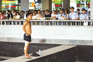 昨天下午3點(diǎn)10分左右,一年輕男子赤裸著上身,下身也僅穿了條黑色短褲,光腳爬上火車站站內(nèi)廣場,地鐵通道上的一根橫梁柱上,其腳下就是近10米高的地下通道,據(jù)圍觀市民介紹,該男子手叉腰部兩側(cè),既不說話,也不挪動半步。旅客見狀紛紛向該男子叫喊,希望他想開一些,可該男子似乎“無動于衷”。