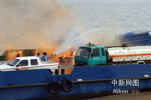 在演習(xí)模擬現(xiàn)場(chǎng),“海太七號(hào)” 在正常航行途中,甲板水手長(zhǎng)突然發(fā)現(xiàn)一車上人員提著一只裝有燃料油的塑料桶下車,飛快走向一輛裝有甲醇危險(xiǎn)品的車輛,將手中的汽油灑向甲醇車,掏出打火機(jī)、點(diǎn)燃大火。他跳上裝有甲醇的槽罐車開(kāi)啟閥門,讓甲醇泄漏,企圖制造更大的恐怖事件。渡船船員迅速與恐怖分子展開(kāi)搏斗,組織滅火,并將險(xiǎn)情向海門市政府和南通海事局交管中心報(bào)告。
