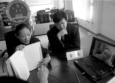 法官通過攝像頭向遠(yuǎn)在美國(guó)的焦老漢展示材料。 本報(bào)記者王儉攝