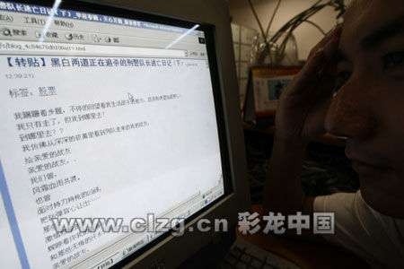網(wǎng)友上網(wǎng)觀看關(guān)于“刑警隊長逃亡日記”的帖子。王磊 攝