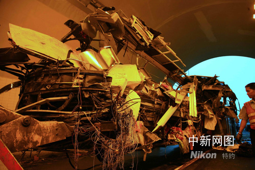 記者趕到現(xiàn)場(chǎng)時(shí),受傷人員已被救出送往醫(yī)院搶救。高速交警、路政等有關(guān)人員正在現(xiàn)場(chǎng)處理,施救人員正在清理路面。一輛臥鋪大客車停在隧道入口的地方,車頭已面目全非,靠駕駛員一側(cè)車身大半像被刀劈開(kāi)一樣。入隧道口之前的中間護(hù)欄也已被毀,地上滿是客車上掉下外殼、玻璃等殘骸和旅客行李。