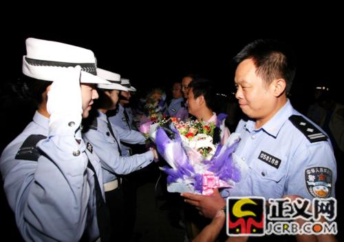 向凱旋歸來(lái)的辦案民警獻(xiàn)花。