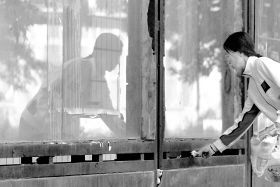 幾分鐘后,那名女子又走了回來,放在玻璃窗內(nèi)一些食物。記者立即過去與之攀談。
