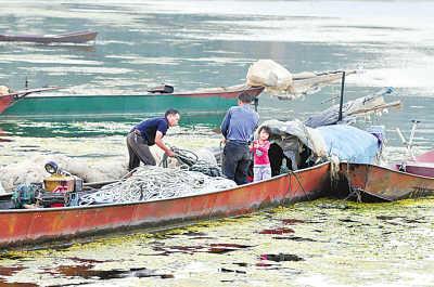 位于陽(yáng)宗海邊的昆明市宜良縣湯池鎮(zhèn)施家嘴村,當(dāng)?shù)卮迕竦纳钆c陽(yáng)宗海息息相關(guān)。記者看到,這里隨處可見的是昆明、玉溪兩市政府對(duì)陽(yáng)宗海實(shí)施“三禁”的通告:禁止飲用陽(yáng)宗海水;禁止在陽(yáng)宗海游泳;禁止捕撈陽(yáng)宗海的水生產(chǎn)品。通告的簽發(fā)日期是9月17日。