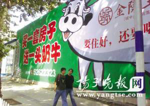 “買一套房子,送一頭奶!保瑫r下開發(fā)商不僅在樓盤的價格上大動腦筋,就連樓盤廣告也很雷很唬人。昨天,南京新街口的一處巨幅房產(chǎn)海報,再次吸引了眾多路人的眼球。