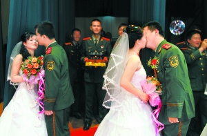 “非常有紀念意義!鄙衔9時,警官王忠燦摟著他美麗的新娘,開心地評價著即將開始的集體婚禮。9時25分,包括王忠燦在內的21名武警北京總隊十三支隊的新郎官,分別背著他們的新娘,登上貼著喜字的大轎車。在威風鑼鼓的喜樂中,悍馬指揮車引導著婚車,緩緩向警營駛去,一場別開生面的集體婚禮開始了。