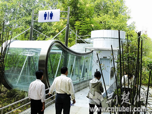 綠樹、翠竹掩映之間,遠看好像是一座玻璃和不銹鋼結(jié)構(gòu)的涼亭,走近才發(fā)現(xiàn),沿臺階或電梯往下,竟是一座漂亮的免費公廁。昨日,位于漢口解放公園大門南側(cè)的江城首座地下公廁投入試運行。