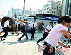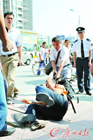 廣州日報10月18日報道 昨天上午10時,廣州市中山大道,四個壯漢當(dāng)街毆打一名《廣州青年報》的送報員,兩名白色衣服的保安自始至終在一邊旁觀。后來,有市民上前勸說阻擋,并協(xié)助警察將其中兩名犯罪嫌疑人抓獲。