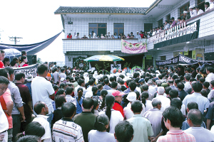 聞?dòng)嵑螘洝白摺绷耍瑬|升村2000多名村民從村子四處趕到何家,送這位好書記最后一程,黑壓壓的人群將何家屋前院壩擠得滿滿的。