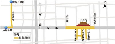 限行路段:天安門廣場西側路、人民大會堂南側路,社會車輛禁行,廣場東側路改為雙行。