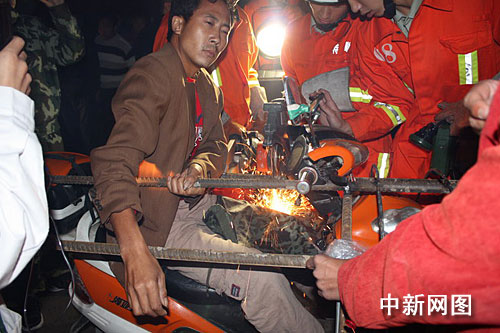余姚消防大隊(duì)接到報(bào)警后,調(diào)派兩輛消防車9名消防員趕赴現(xiàn)場。在對現(xiàn)場進(jìn)行了警戒之后,余姚消防大隊(duì)的王中隊(duì)長利用機(jī)動液壓擴(kuò)張剪先把插入朱先生體內(nèi)的鋼筋固定后,由另一名消防員用無齒鋸對鋼筋進(jìn)行切割。為讓切割過程中,朱先生免受高溫傷害,消防員在切割時用水對鋼筋進(jìn)行降溫,在用完整整一瓶礦泉水后,朱先生終于成功被救出,并送上了救護(hù)車。