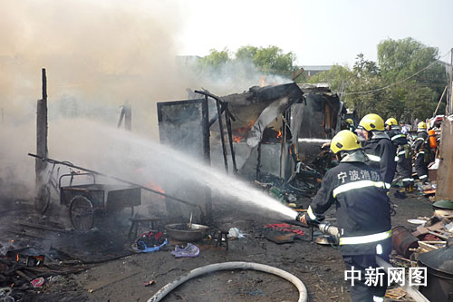 在離火場幾百米之外,消防官兵就看見了火場上空夾帶著紅色火焰的滾滾黑煙。09時20分,江東中隊、彩虹路中隊、天一中隊滅火力量相繼到達火場,此時,現(xiàn)場火勢正處于猛烈燃燒階段。官兵們經(jīng)偵察后,發(fā)現(xiàn)起火燃燒的是一片用石棉瓦搭蓋而成的簡易棚戶區(qū)房屋,肆虐的“火魔”已將大多數(shù)房頂整個燒穿,大量的石棉瓦磚塊整塊塌陷下來,現(xiàn)場陷入一片火海之中。