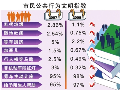 調(diào)查顯示,2008年北京奧運會期間,北京市“市民公共行為文明指數(shù)”為82.68,比去年提高了9.3個分值。